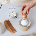 Voorbereiden: Vul een kom met warm water en laat de scheerkwast enkele minuten inweken. Dit verzacht de haren van de kwast en zorgt ervoor dat ze meer water vasthouden, wat helpt bij het creëren van een rijk schuim.